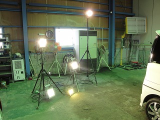 磨き作業では照明が非常に大事です。特に、洗車キズや磨くことによって付く磨きキズをしっかり確認するためには、照明の種類や当て方が重要になります。